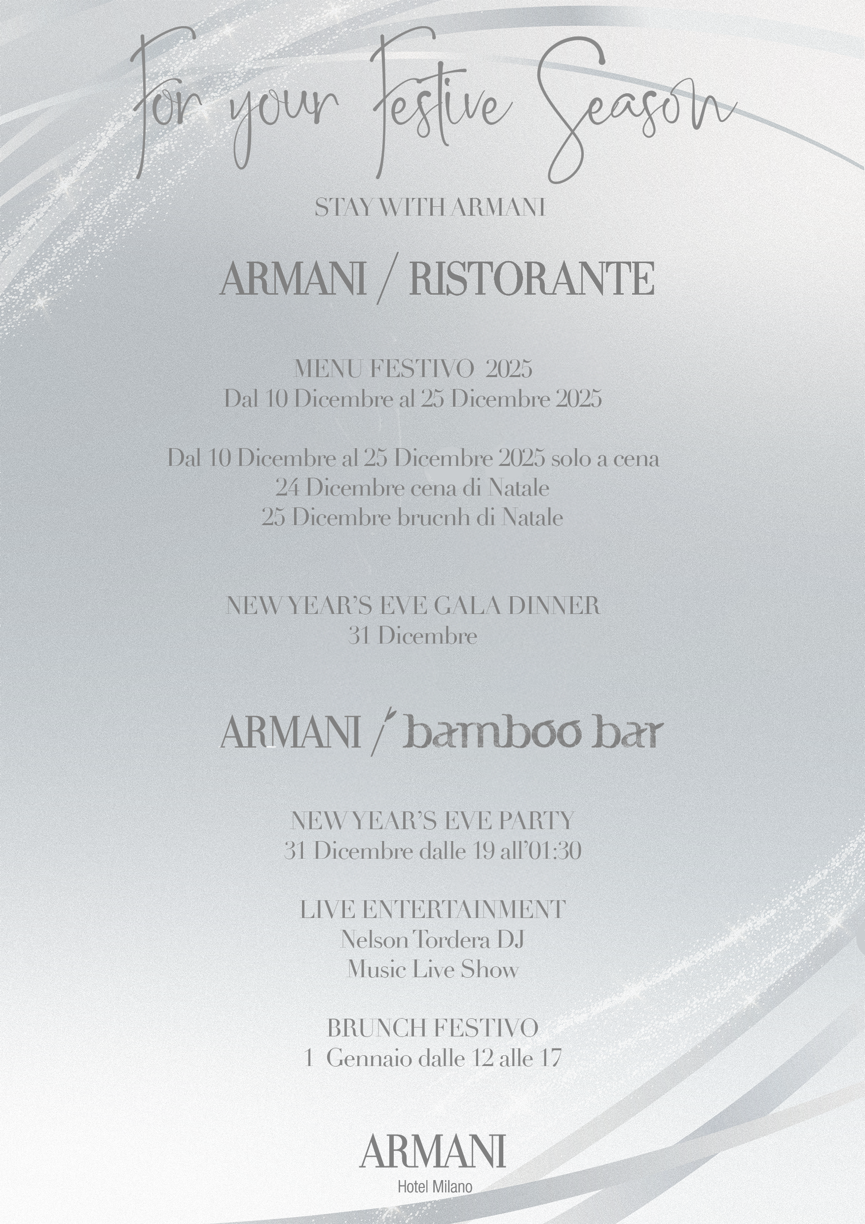 Da proposte gourmet speciali a esperienze di benessere presso l’Armani/SPA, scegli il pacchetto che meglio risponde ai tuoi desideri e trascorri con noi il momento più atteso dell’anno.