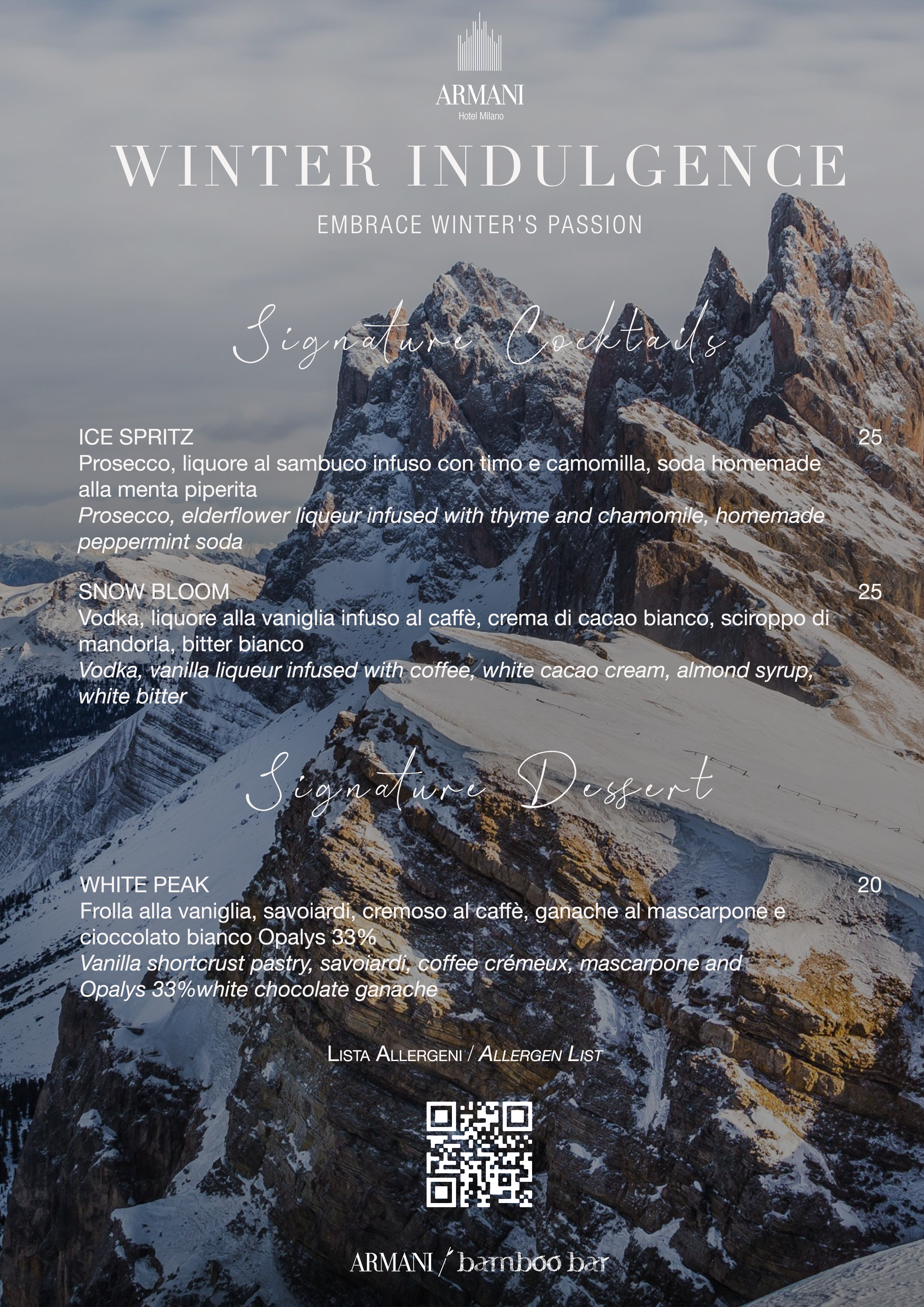 Discover our mixology creations inspired by ice and snow, available at the Armani/Bamboo Bar from February 6 to 28.