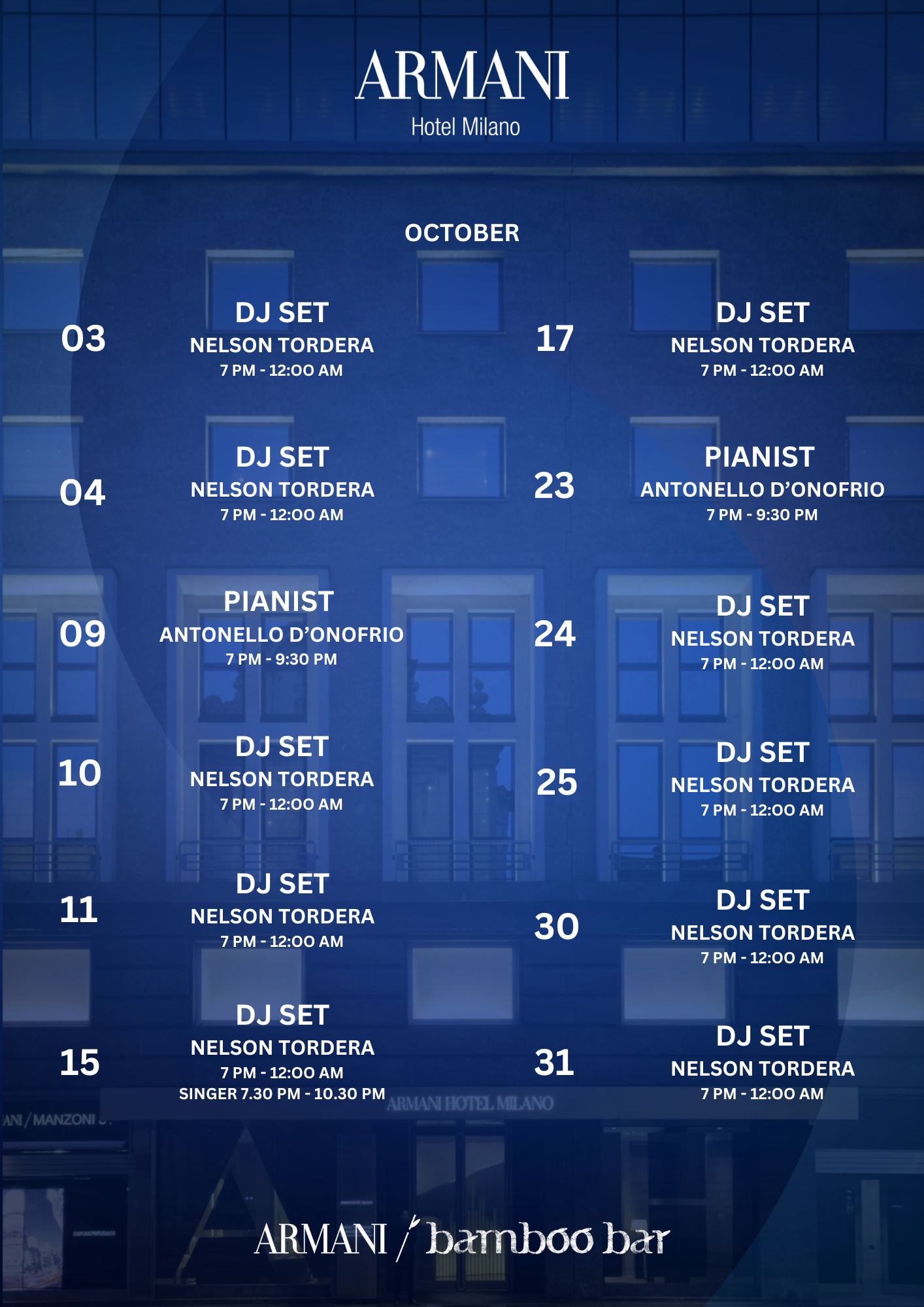 Nel mese di ottobre, dalle 19 fino a mezzanotte, l’Armani Hotel Milano, presenta in serate selezionate un’esperienza musicale esclusiva presso l’Armani/Bamboo Bar.