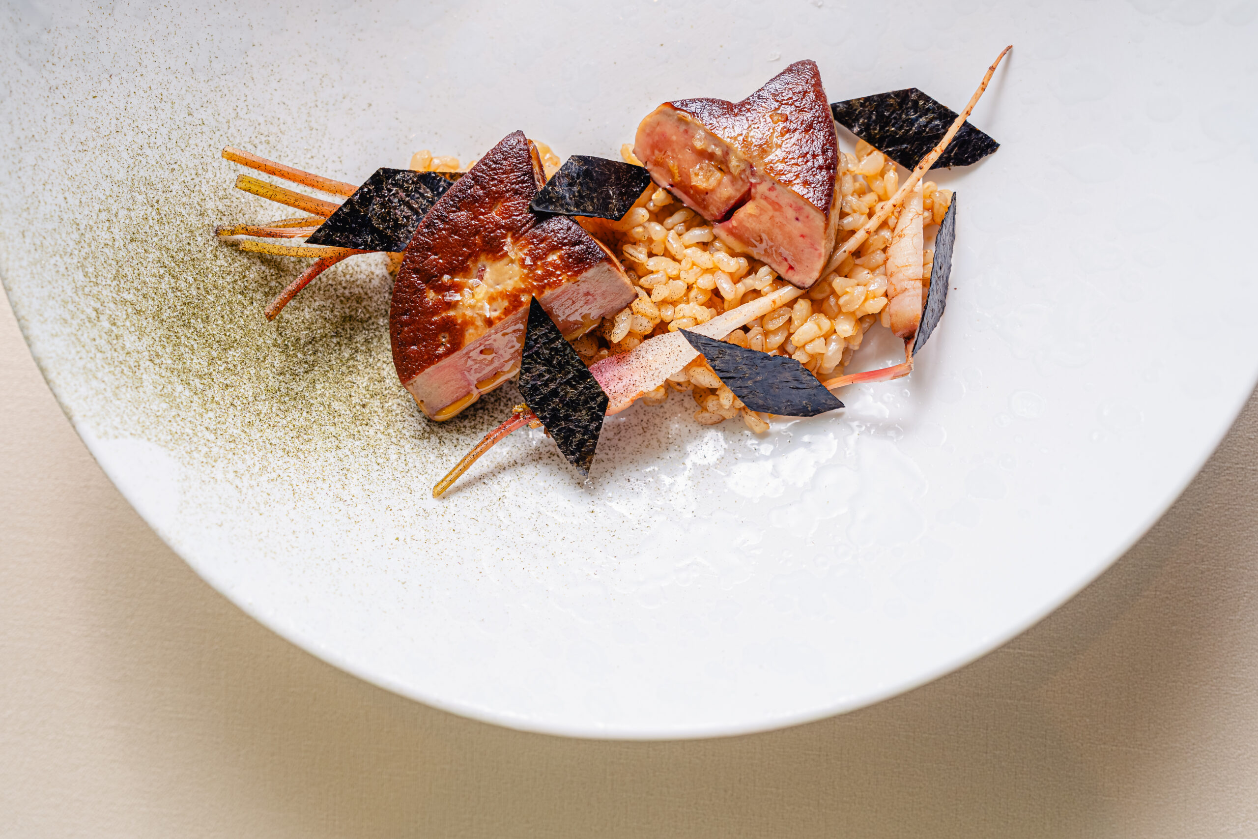 - Foie Gras d'oca scottato, tamari, riso, radici di prezzolo e alga nori.